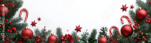 A charming Christmas greeting card frame adorned with vibrant red and green ornaments, candy canes, and twinkling stars, all set against a pure white background that highlights the joyful holiday