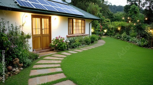 bungalow, garden, solar, greenery, landscaping, serenity, calmness, sustainable, aesthetic, harmony, residential, peaceful, lawn, yard, comfort, inviting, sunlight, roofing, cosy, retreat, plant, habitat, energy, pathway, rural, charming, home, shrub, exterior, space, modern, house, lifestyle, flower, design, decor, beauty, environmentally friendly, nature, environment, natural, architecture, organic