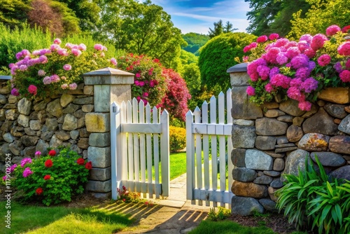 wooden fence, garden fence, gate, rock wall, pink flower, shrub, greengrass, countryside, natural light, soft light, garden design, landscaping, floral arrangement, stone wall, greenery, country life, flowerbed, flora, backyard
