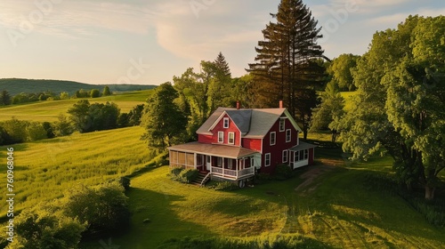 A charming farmhouse with a red barn surrounded by acres of farmland AI generated illustration