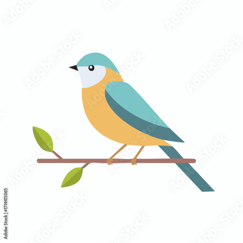 A charming flat design illustration of a small songbird with soft blue and yellow plumage, gently resting on a green-leafed branch, embodying the concept of natural tranquility and simple beauty