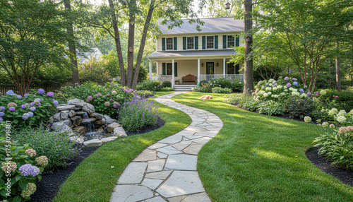 home, garden, pathway, flower, stone, residence, landscaping, serene, harmony, relaxing, porch, calmness, suburb, peaceful, attracted, retreat, inviting, charme, welcoming, yard, elegance, aesthetic, blossom, suppressing, greenery, vibrant, comfort, plant, shrub, picturesque, lifestyle, style, design, sunlight, decor, tree, scenic, beauty, foliage, nature, environment, rural, natural, architecture, flora, hydrangea