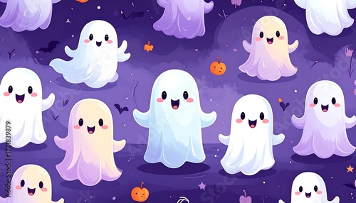 A charming illustration features cartoon ghosts in various sizes, smiling joyfully against a dark, dreamy background with pumpkins and bats
