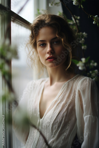 woman, contemplative, window, portrait, young, dress, white, pensive, flower, soft, loneliness, peaceful, introspective, beauty, natural, gentle, feminine, mood, serene, elegant, calm, introspection, fashion, lifestyle