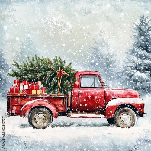 A charming red vintage truck carries festive gifts and a Christmas tree in the snow.