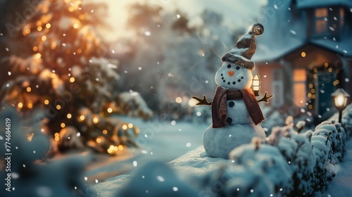 A charming snowman in a hat and scarf standing in the snow-covered garden of a house decorated for Christmas, surrounded by twinkling lights and falling snowflakes, creates a magical atmosphere