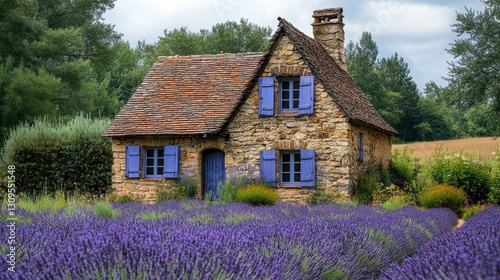 A charming stone cottage surrounded by vibrant lavender fields and lush greenery under a partly cloudy sky.