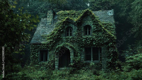 A charming stone house covered in ivy, sitting peacefully in a dark, shadowy woodland