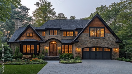 house, architecture, stone, light, garden, landscaping, entrance, window, driveway, tree, design, exterior, home, nature, evening, residential, warmth, style, roof, symmetry, inviting, suppressing, attracted, peaceful, modern, rustic, comfort, structure, detail, porch, step, atmosphere, aesthetic, environment, cosy, elegant, facades, space, calmness, harmony, neighbourhood, beauty, craftsmanship, property, setting, illumination, charme, greenery