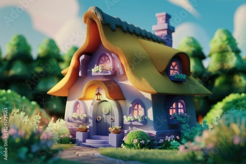 A charming, whimsical cottage nestled in a vibrant, fairytale forest.