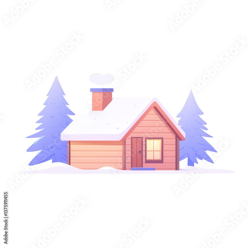 A charming wooden cabin with a snowy roof and chimney, surrounded by tall evergreen trees, perfect for winter illustrations or seasonal designs.