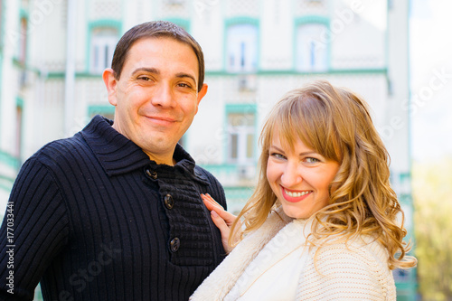 A cheerful and positive couple man and woman are walking in the city, relaxing and enjoying time with each other. The concept of feelings and love in middle-aged people