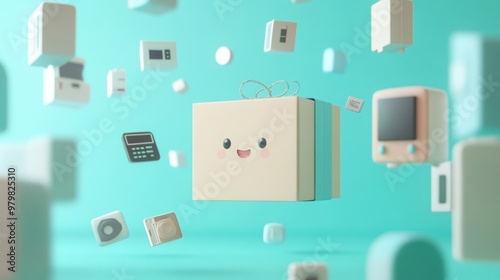 A cheerful, animated box surrounded by playful, stylized electronic devices in a vibrant setting.