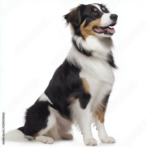 A cheerful Australian shepherd dog sitting calmly, showcasing its beautiful coat and friendly expression.