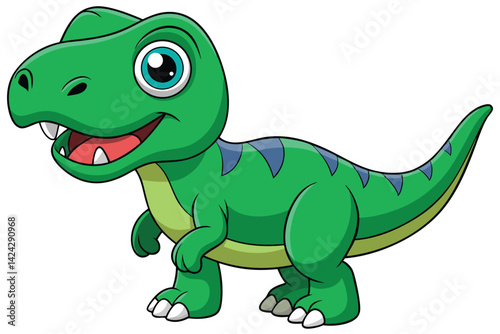 A cheerful cartoon tyrannosaurus with green scales and bright eyes stands smiling on a white background, Tyrannosaurus cartoon on white background.