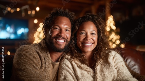 A cheerful couple snuggles together in a cozy setting, surrounded by warm decorations, evoking feelings of love, comfort, and relaxation for lifestyle and home decor themes.