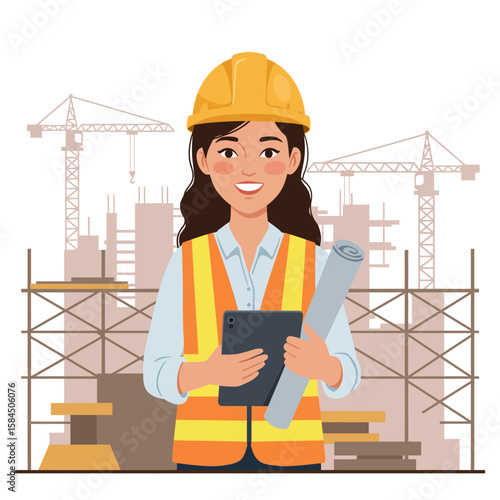 A cheerful female construction worker in a hard hat and safety vest is holding blueprints and a tablet, smiling against a construction site backdrop illustration.
