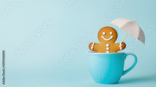 A cheerful gingerbread cookie with a smile holds an umbrella while sitting in a light blue cup against a soft background.