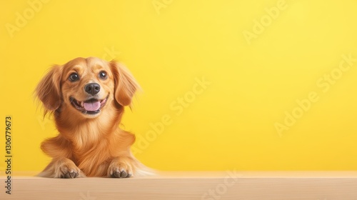 A cheerful golden dog rests its head on a surface, with a bright yellow background enhancing its playful demeanor.