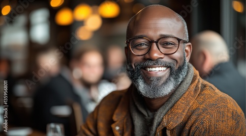 A cheerful man with a beard and glasses sits at a table in a cozy cafe. He is wearing a brown sweater and engaging with others in a lively, warm atmosphere during a busy afternoon