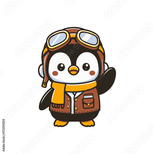 A cheerful penguin dressed as an aviator waves, set against a simple white background