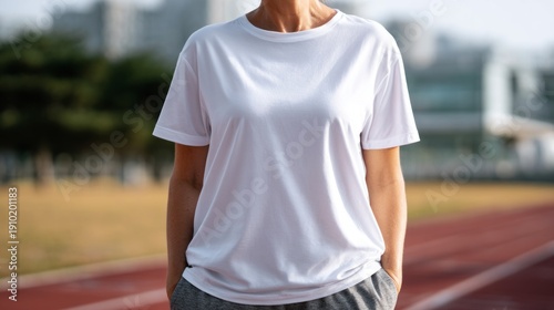 A cheerful plump woman stands confidently at an outdoor track, showcasing a funny T-shirt. The bright sun shines and the cityscape adds a fun vibe to her casual attire and relaxed pose
