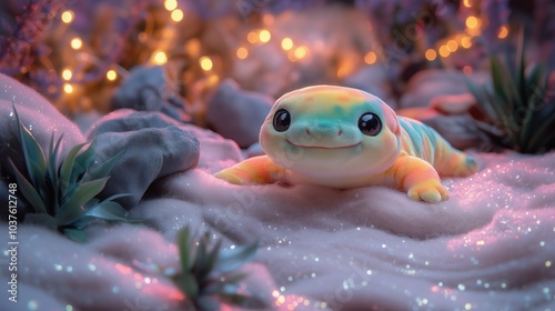 A cheerful plush gecko toy basking on a sparkling desert surface surrounded by glowing rocks and vibrant plants under a dreamy atmosphere