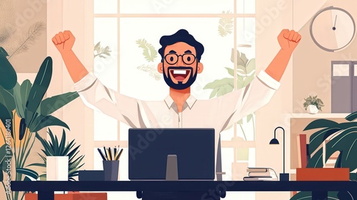 A cheerful professional celebrating success in the office, arms raised with excitement .