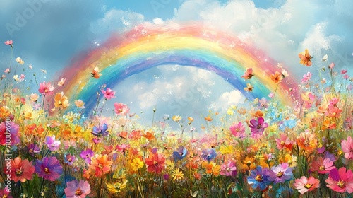 cheerful, rainbow, arch, vibrant, field, flower, soft, pastel, hue, create, aethereal, whimsical, playful, youthful, paint, modern, nature, artistic, peaceful, upscale, joyful, magical, lively, beautiful, art, lovely, elegant, graceful, colourful, high-coloured, design, spectrum, inspire, dreamy, happy, serene, sweet, decor, spirit, charming, watercolor, painting, children, room, childcare center, creative, oil