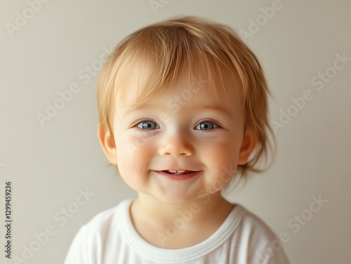 A cheerful toddler is smiling wide, radiating joy and innocence. Soft natural light highlights the child's happy expression against a simple, neutral background