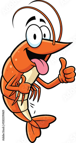 A cheerful, vibrant cartoon shrimp character, perfectly cooked and red, enthusiastically gives a double thumbs-up, showcasing fun, delicious seafood with an inviting, happy expression