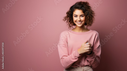 pink, sweater, woman, cheerful, curly hair, posing, confident, happiness, beauty, fashion, smiling, style, vibrant, casual attire, modern, studio, thumb up, approval, friendly, joyful, personality, bright, monochrome, positive, trendy, young adult, success, clean, simplicity, energetic, vibrantly, wellness, comfort, pleasure, leisure, expressive, agreeable, independence, youth