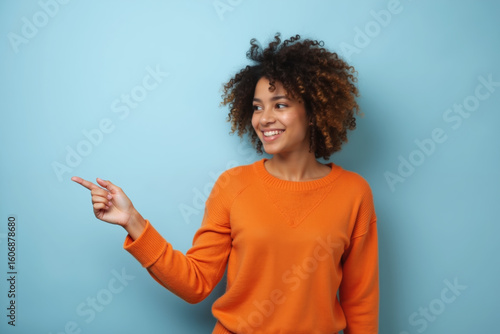 woman, smiling, happy, cheerful, pointing, finger, left, orange, sweater, curly, hair, bright, background, blue, standing, joyful, friendly, casual attire, confident, vibrant, positive, energetic, enthusiastic, young, adult, female, portrait, expression, gesture, indication, direction, photo, realistic, real