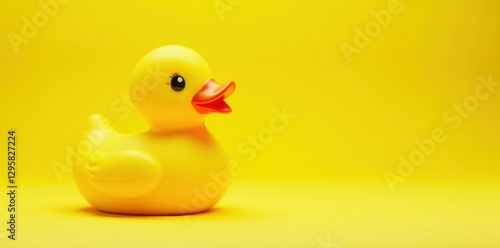 A cheerful yellow rubber ducky on a vibrant yellow background, perfect for showcasing childhood innocence and playful fun.