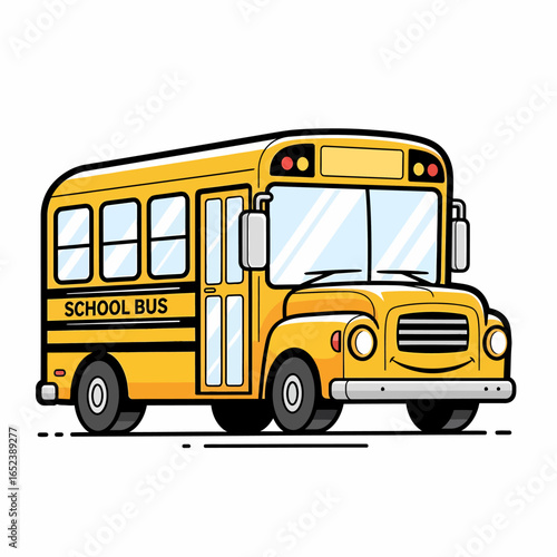 A cheerful yellow school bus with "SCHOOL BUS" written on its side, depicted in a cartoon style with large windows and a friendly front.