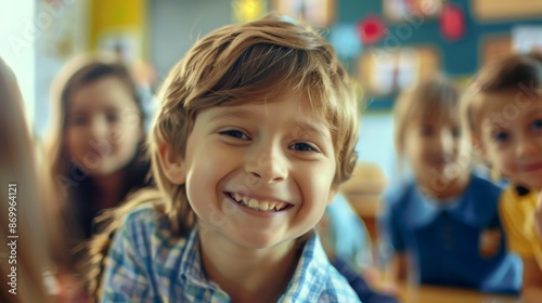 A cheerful young boy smiles brightly at the camera, with classmates in the background, radiating positivity and innocence in a cheerful classroom.