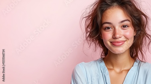 A cheerful young woman smiles warmly against a soft pink background, radiating natural beauty and a sense of happiness that connects with viewers instantly.