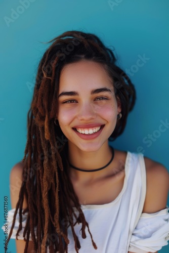 A cheerful young woman with stylish dreadlocks radiates happiness and confidence in her unique hairstyle and personality.