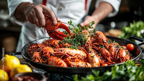 A chef expertly prepares fresh seafood, showcasing vibrant lobsters and herbs in a traditional dish, ideal for gourmet cooking.
