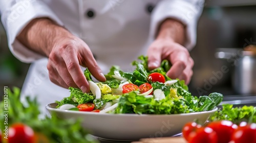 chef, salad, kitchen, culinary, vegetable, fresh, tomatoes, professional, white coat, art, culinary arts, greener, cooking, preparation, food, garnish, healthy, dining, epicure, precision, meticulous, artful, cookery, vibrant, delicious, crisp, skill, bowl, ingredient, workspace, hospitality, eatery, craft, presentation, lifestyle, contemporary, favor, modern, training, expertise, freshness, nourishment, receipe