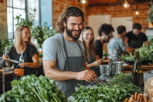 A chef joyfully prepares a healthy meal in a cooking class. Fresh herbs and greens are the stars of this culinary experience.