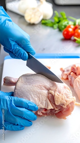 chef, poultry, meat, knife, slicing, cutting, glove, blue, preparation, kitchen, cooking, food, ingredient, raw, chicken, leg, breast, closeup, perspective, white, board, countertop, garlic, tomatoes, basil, fresh, clean, stainless, surface, healthy