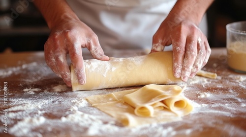 A chef rolling dough on a floured countertop, preparing fresh pasta from scratch