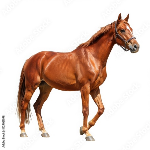 horse, chestnut, equine, animal, mammal, fast horse, mare, breed, domestic, farm, rural, nature, outdoors, isolated, white, background, walking, motion, leg, tail, mane, head, bridle, leather, brown, portrait, studio, full, body, view