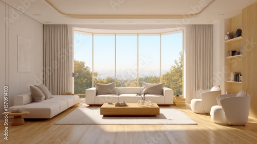 A chic minimalist living room with a large open window, white furniture, and warm wooden flooring.