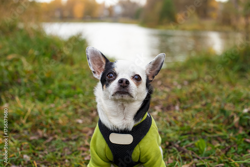 A chihuahua dog. Portrait of a funny little dog sitting on the riverbank.