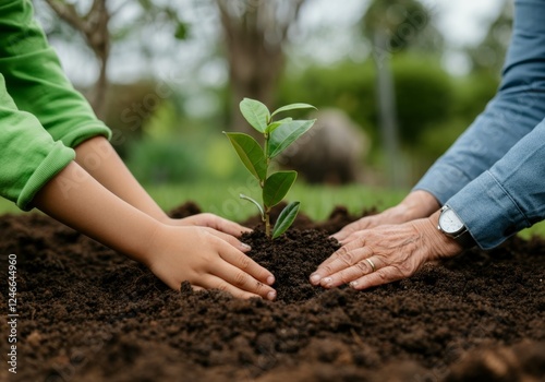 children, elderly, grandparent, planting, tree, backyard, sustainability, teamwork, family, gardening, environment, green, earth, environmentally friendly, nature, together, nurturing, growth, children, senior, elder, bonding, dirtied, nature conservation, promoting, reforestation, generation, love, eco, renewable, grandparent