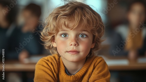 A child answering a question enthusiastically, sitting in class with a softly blurred background of peers