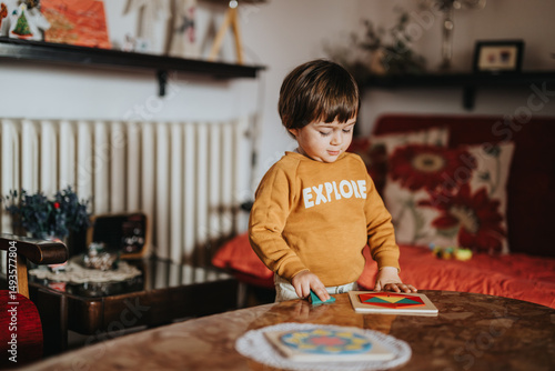 A child wearing an orange sweater with the word Explore engages with geometric puzzles on a wooden table, surrounded by a neatly arranged and warm home interior.