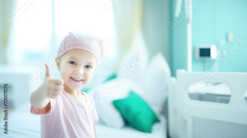A child with cancer standing in his hospital room, with his head covered with a pink scarf, smiles and gives a thumbs up, with a positive attitude in the fight against cancer. copy space